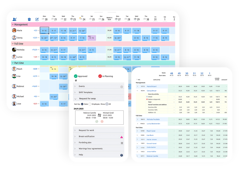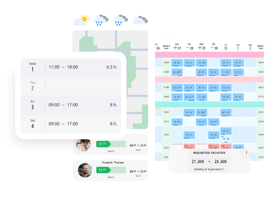Få vagtplanlægning og tidsregistrering samlet i ét smart system. Tilpas vagter, håndtér fravær og bytte nemt, mens du sikrer regler og holder omkostninger nede.