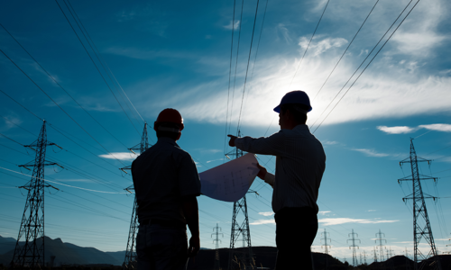 Byggeteam bruger intelligente løsninger på en digital tablet til at optimere planlægning af arbejdsstyrken og effektivitet.